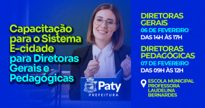 Nos dias 7 e 9 de fevereiro de 2025 , será realizada, na Escola Municipal Professora Laudelina Bernardes, capacitação sobre o sistema de gestão e-Cidade , destinada às Diretoras Gerais e Pedagógicas .