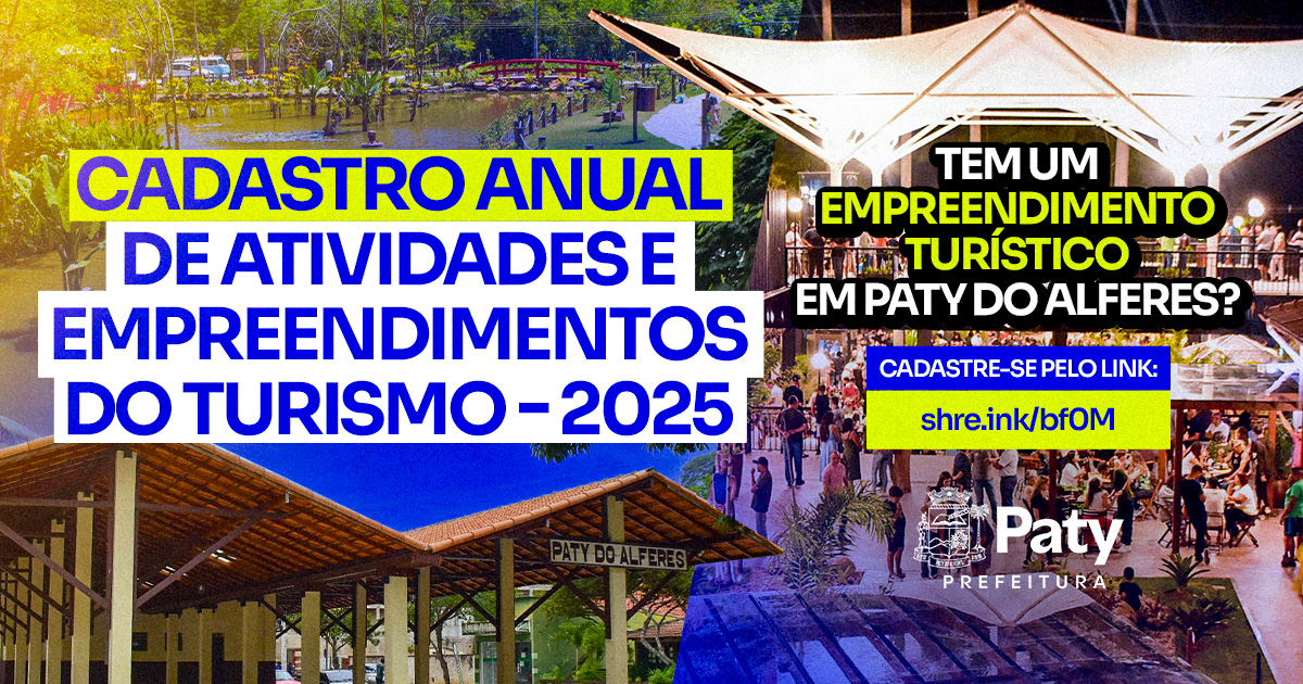 Estamos atualizando o cadastro de empreendimentos turísticos de Paty do Alferes. Se você tem um empreendimento turístico no setor de gastronomia, turismo de experiência (agroturismo, ecoturismo, etc.), mobilidade urbana, ou qualquer outro empreendimento ligado ao atendimento de turistas, cadastre-o neste formulário.