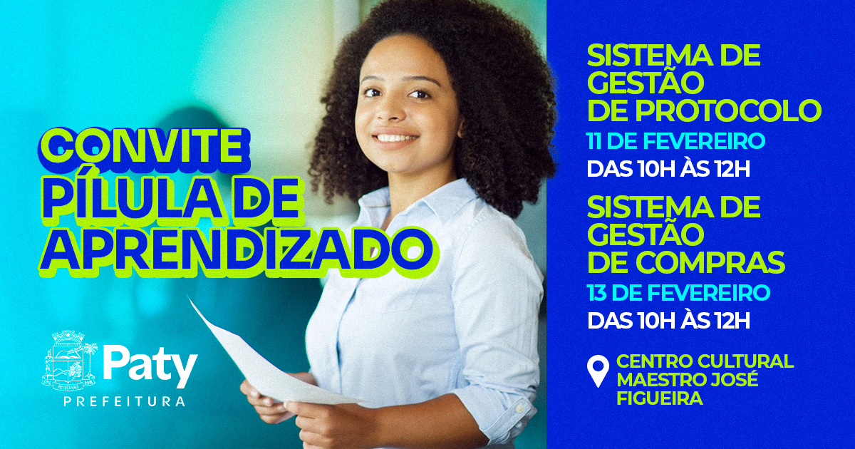 Nos dias 11 e 13 de fevereiro de 2025, será realizada, no Centro Cultural do Município, Pílulas de Aprendizado sobre o sistema de gestão e-Cidade, voltada aos usuários dos módulos Protocolo e Compras.